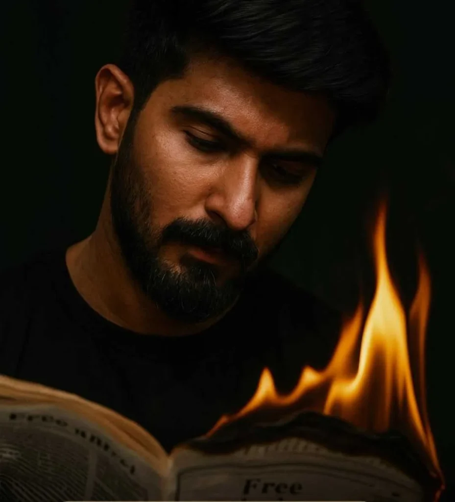 Create a high-quality, photorealistic image of the same subject with sharp facial features. He should be wearing a black shirt for a bold, modern look. His expression must be serious and contemplative as he looks down at a burning newspaper he holds. The atmosphere should be intense and mysterious, with dramatic lighting. Replace the face […]