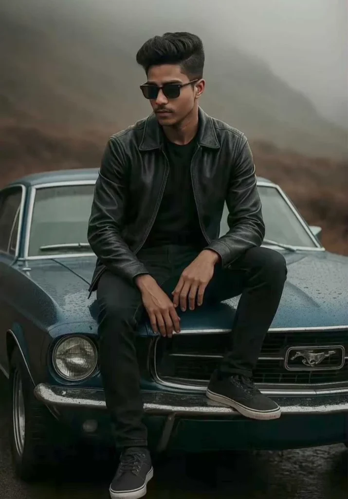 A highly realistic, full-body cinematic portrait of a stylish young man (age 21, skinny fit) with a quiff hairstyle and light mustache. He is sitting casually on the hood of a vintage blue American muscle car, wearing a black leather jacket, black pants, and black sneakers with white soles. He has dark sunglasses on and […]