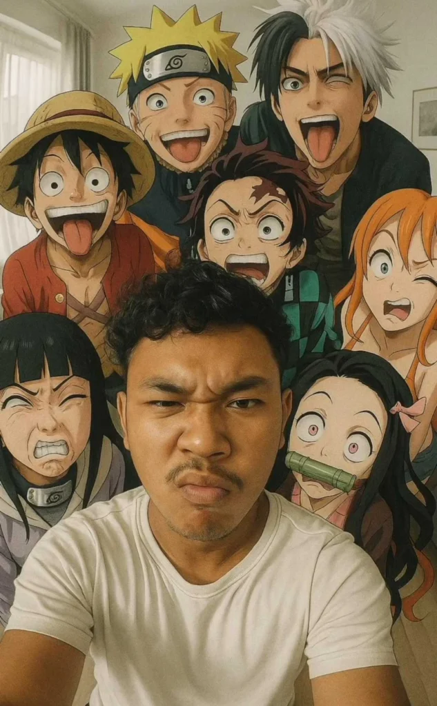 Ultra-realistic 9:16 vertical format fisheye selfie of me with [luffy, Naruto, Tanjiro,Eren,Gojo]. We’re all making silly, exaggerated faces. Set in a small, bright living room with white tones. High camera angle. Extreme fisheye distortion. Realistic, cinematic lighting, anime characters integrated with stylized realism