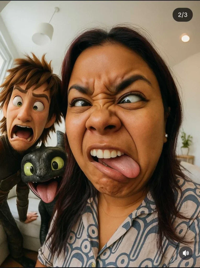 ULTRA-REALISTIC 9:16 VERTICAL FORMAT FISHEYE SELFIE OF ME WITH [SOLUÇO E BANGUELA DE COMO TREINAR SEU DRAGÃO]. WE’RE ALL MAKING SILLY, EXAGGERATED FACES. SET IN A SMALL, BRIGHT LIVING ROOM WITH WHITE TONES. HIGH CAMERA ANGLE. EXTREME FISHEYE DISTORTION. REALISTIC, CINEMATIC LIGHTING, ANIME CHARACTERS INTEGRATED WITH STYLIZED REALISM.